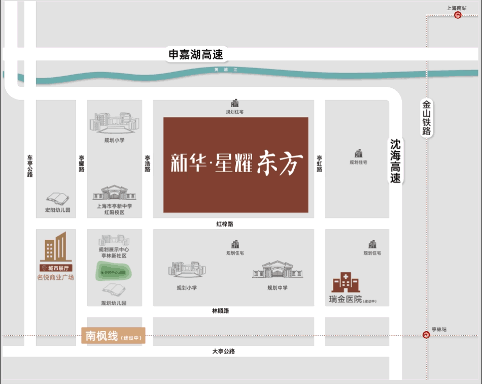 新华星耀东方坐落于上海市金山区亭林镇亭浩取红梓交汇处,
